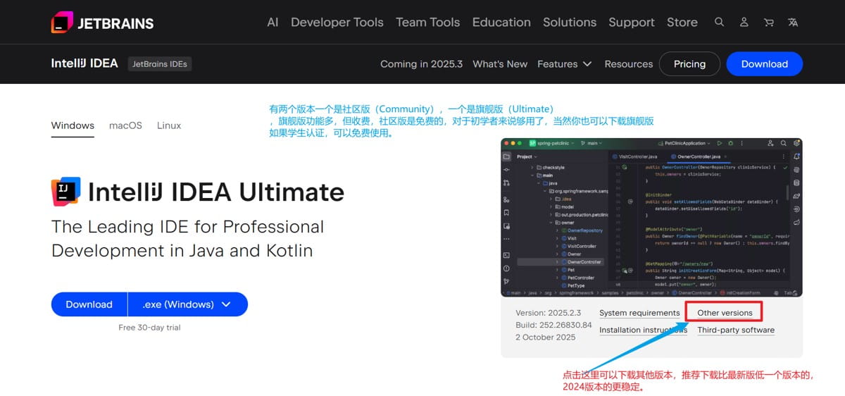 IDE有很多,比较主流的IDE有三个IntelliJ IDEA,Eclipse,VSCode,对于初学者来说我推荐使用IDEA,因为我就用的IDEA,挺好用的,它的智能代码补全和错误提示能帮你更快地熟悉Java语法,养成良好的编程习惯,但是它开启的时候占的内存较大,如果电脑配置较低,也可以选择VSCode。这里安装IntelliJ IDEA。