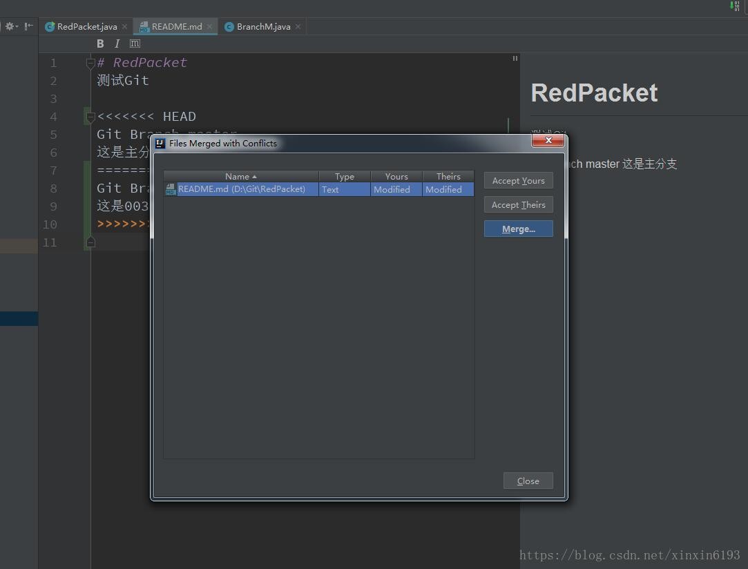 然后就会发现有冲突的文件进行合并,不冲突的直接更改或者新增