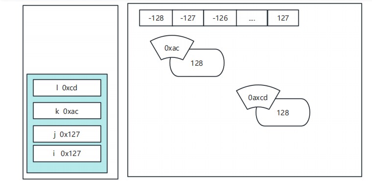 堆内存中有Cache数组(-128~127),首先main方法入栈,i入参127在-128~127之间,则返回了127的地址值,同理,j入参127在-128~127之间,则返回了127的地址值,它们指向同一个地址,所以返回true。而k和l呢?k入参了128,并不在-128~127之间,所以会重新创建了新对象,返回新的地址,l入参了128,并不在-128~127之间,所以会重新创建了新对象,返回新的地址,但是它们创建的新地址并不相同,所以返回false。