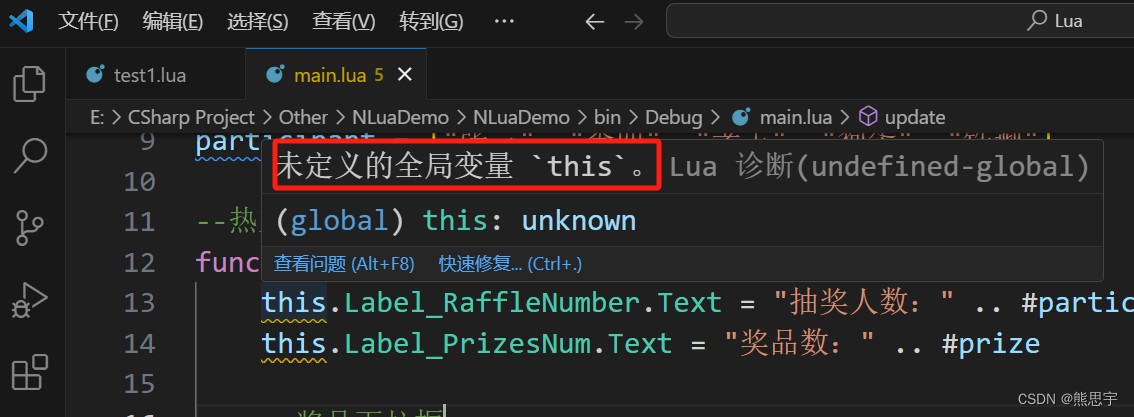 }但是这种用法在 Lua 脚本用会有错误,在 Visual Studio Code 中搭建好 Lua 开发环境,就会看到提示:未定义的全局变量 “this”