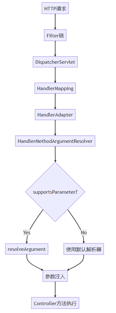 在这个流程中,Spring MVC 会按照注册的顺序遍历所有的 HandlerMethodArgumentResolver,对于每个需要解析的参数,都会调用 supportsParameter() 方法判断是否支持,如果支持则调用 resolveArgument() 方法进行实际的参数解析。