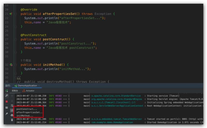 我们继续在 InitServiceImpl 类中增加一个方法,并且在方法上面增加 @PostConstruct 注解,如下所示