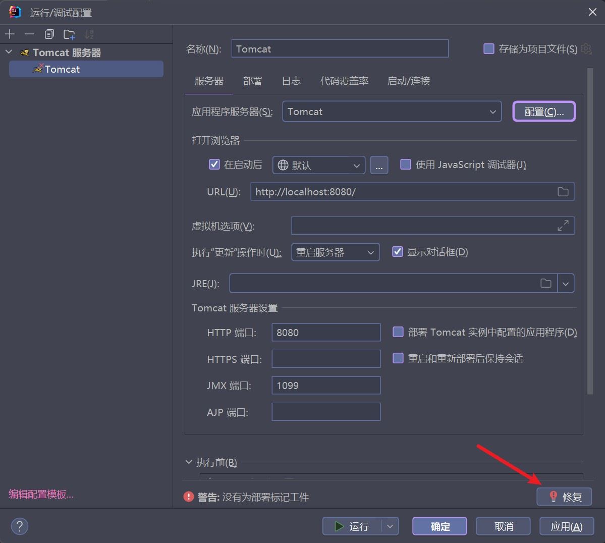 正常来说,当点击 修复 之后会自动跳转到 部署 并且配置好对应的工件,这里只需要更改以下 应用上下文 名称即可,点击 确定。