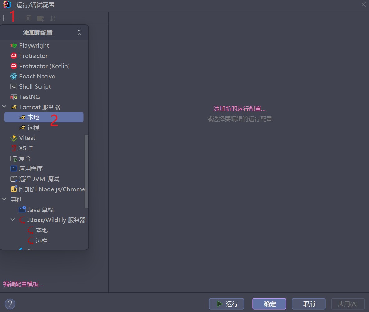 点击 添加新的运行配置…,选中 Tomcat 服务器 -> 本地。