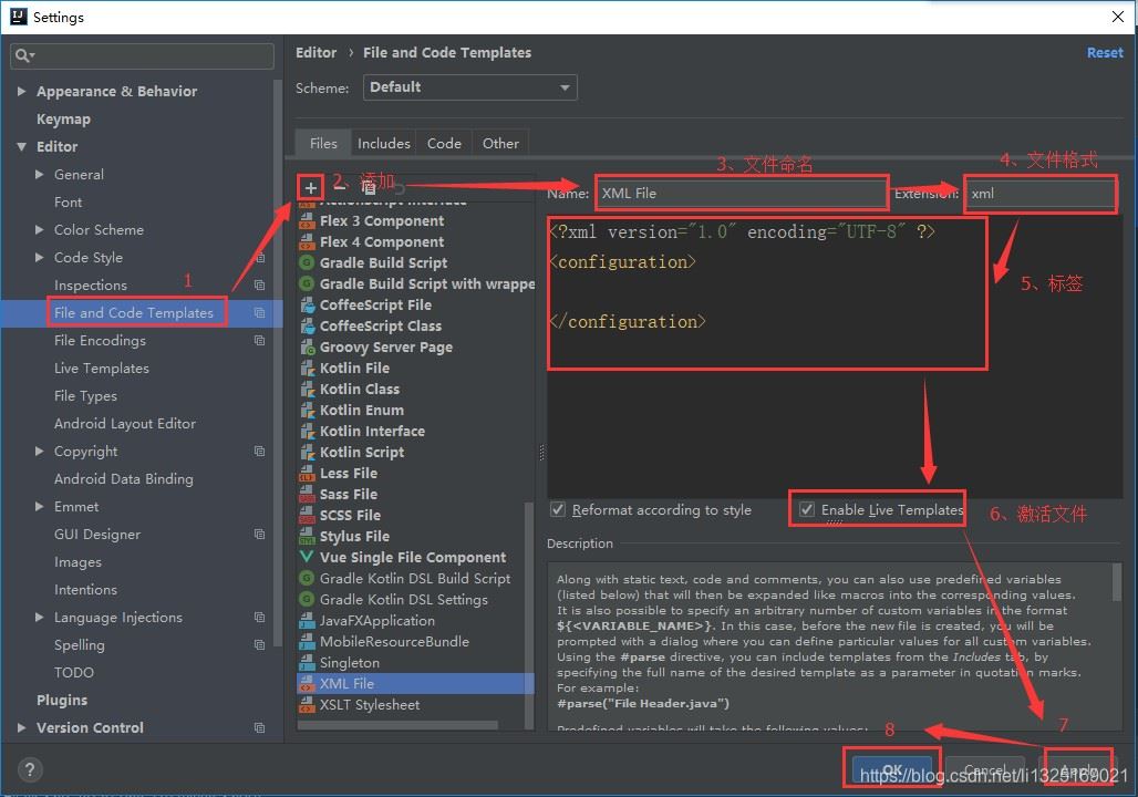 添加模板 ----->输入模板名字:Name:XML File.xml (name可以自定义) ------>后缀名extension:xml —>在面板中间输入内容: