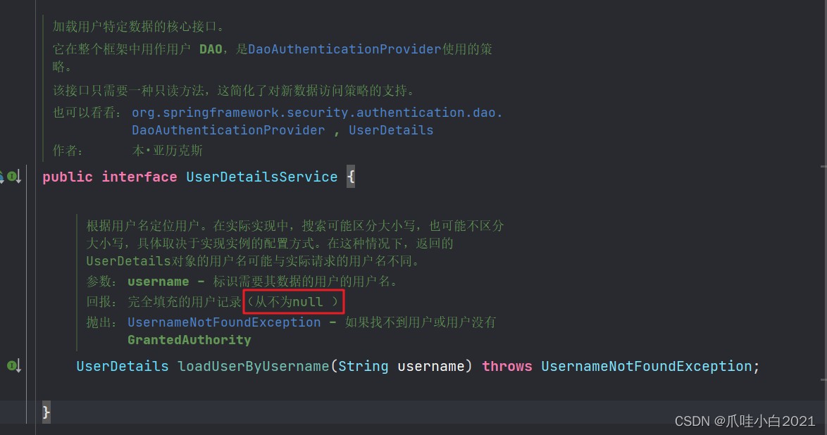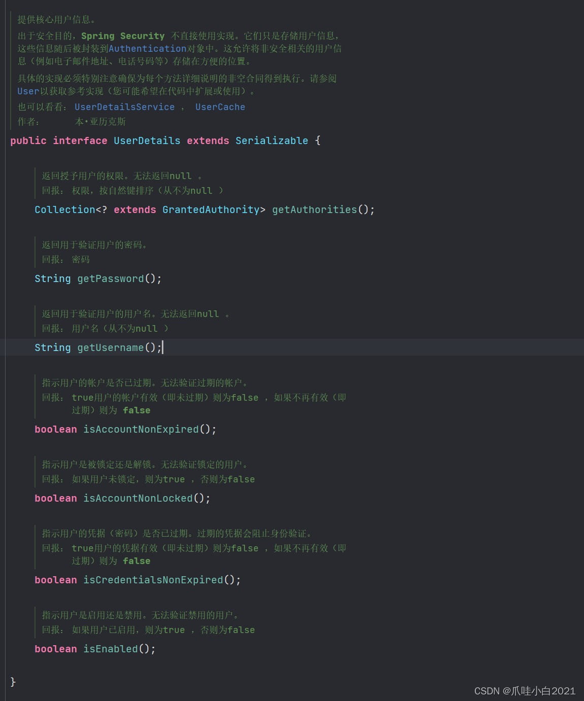 关于security的权限认证可以看一下这个专栏的上一篇文章。 基础概念和入门的demo就不再这里面进行赘述了,今天学习一个这个UserDetailsService,