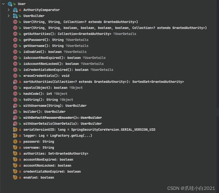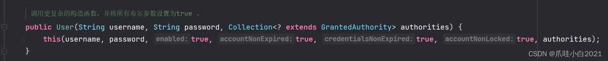 其中构造方法有两个,调用其中任何一个都可以实例化UserDetails 实现类 User 类的实例。而三个参数的构造方法实际上也是调用 7 个参数的构造方法。