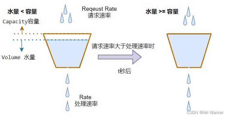 原理:所有的请求都被放入到一个固定容量的桶里,请求按照固定的速率从桶中“漏出”(被处理)。如果桶满了,则会丢弃进来的请求。