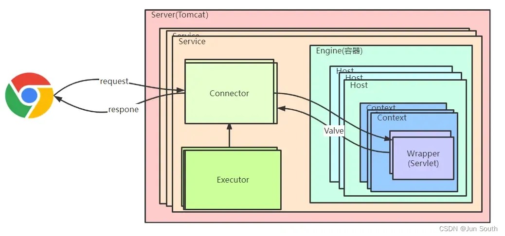 (1)Tomcat中只有一个Server,一个Server可以有多个Service,一个Service可以有多个 Connector(链接) 和一个 Container(容器);