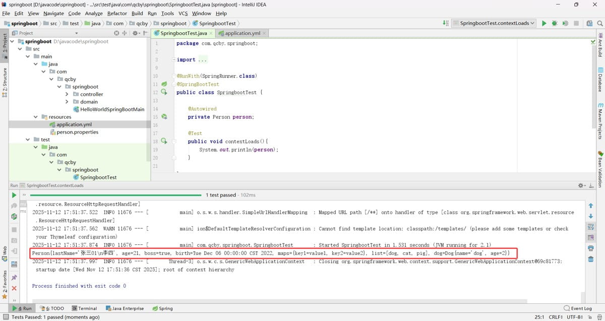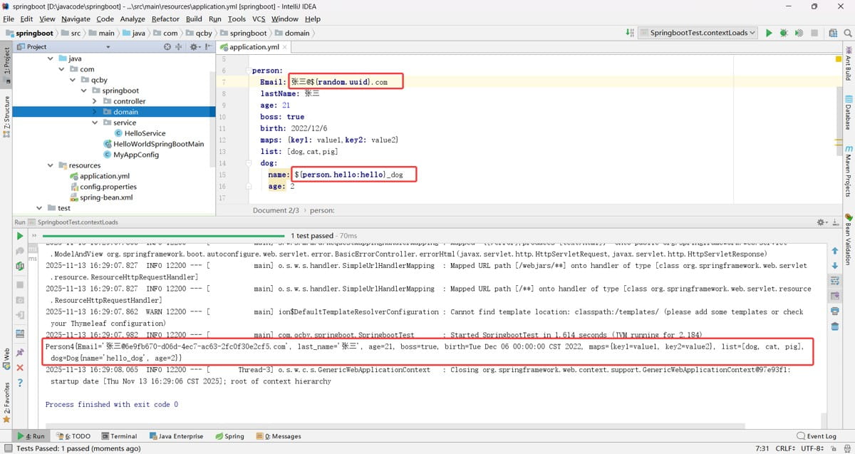 整体核心逻辑:通过 @SpringBootTest 启动 Spring 容器,容器自动扫描并加载 @Configuration 配置类,先通过 @PropertySource 读取自定义配置文件,再通过 @Bean 注册 HelloService 实例到容器,最后 @Autowired 从容器中取出该实例,调用方法验证配置注入是否成功。