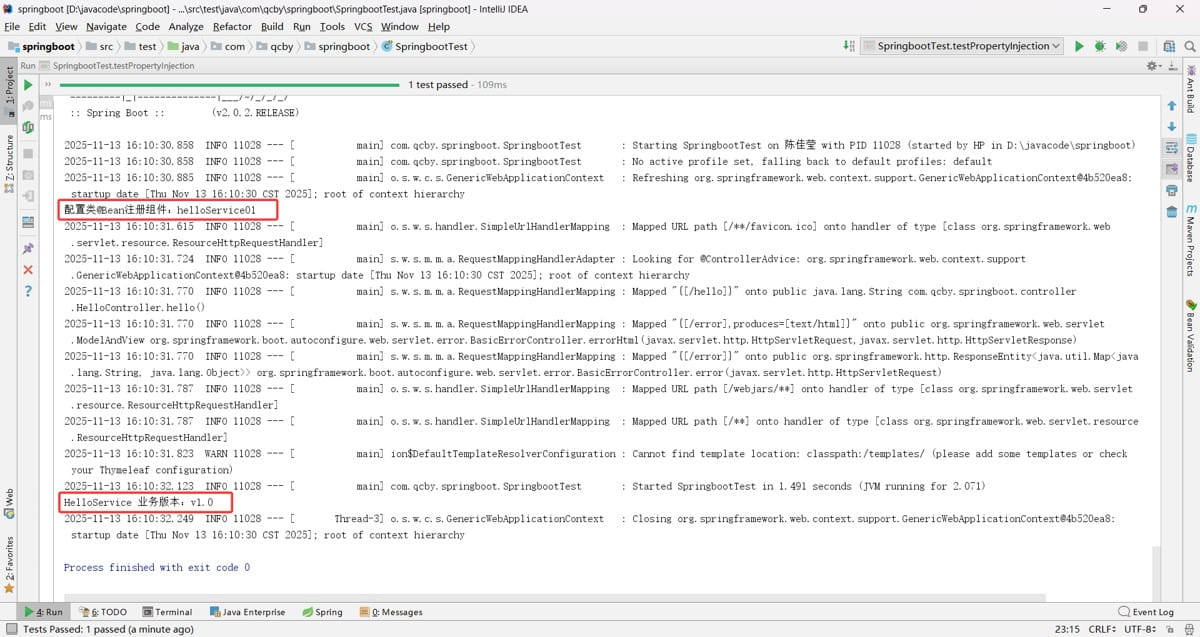 整体核心逻辑:测试类通过 @SpringBootTest 启动 Spring 容器,容器加载 @Configuration 配置类后,通过 @PropertySource 读取自定义配置文件、@ImportResource 导入 XML 配置并注册 HelloService 类型 Bean,Spring 自动为该 Bean 注入配置文件中的版本属性,最终测试类通过 @Autowired 注入 Bean 并调用方法验证属性注入效果。