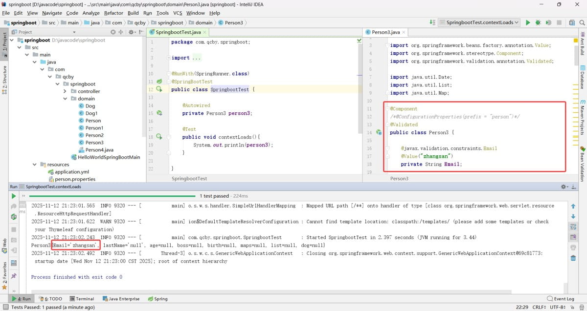 Email 被 @Email 注解修饰,配置文件输入的属性 Email 邮箱不合法时会报错