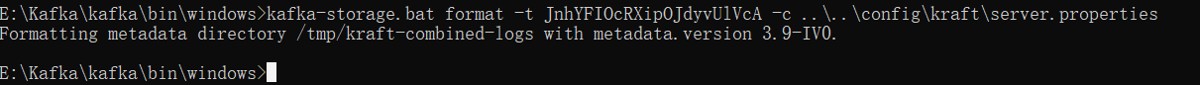// 进入目录:E:\Kafka\kafka\bin\windows下 kafka-storage.bat format -t JnhYFIOcRXipOJdyvUlVcA -c ..\..\config\kraft\server.properties