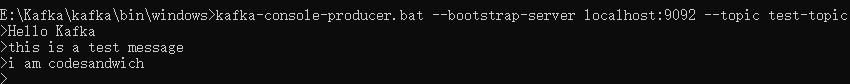 #发送和接收消息 E:\Kafka\kafka\bin\windows>kafka-console-producer.bat --bootstrap-server localhost:9092 --topic test-topic >Hello Kafka >this is a test message >i am codesandwich