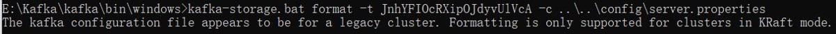 # 使用 kraft 版本的配置文件 kafka-storage.bat format -t JnhYFIOcRXipOJdyvUlVcA -c ..\..\config\kraft\server.properties