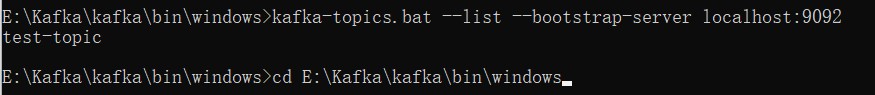 #验证刚刚创建的主题是否正确添加: E:\Kafka\kafka\bin\windows>kafka-topics.bat --list --bootstrap-server localhost:9092 test-topic