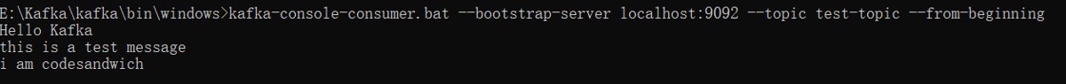 #在另一个cmd窗口 E:\Kafka\kafka\bin\windows>kafka-console-consumer.bat --bootstrap-server localhost:9092 --topic test-topic --from-beginning Hello Kafka this is a test message i am codesandwich