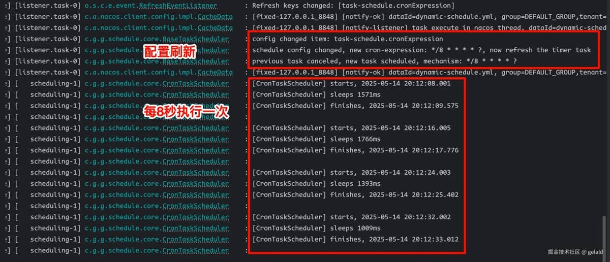 但是启动项目之后发现,无论怎么修改 Nacos 上的配置值,这个定时任务的执行间隔都不会随配置值更新,只会按照首次启动时的 cron 表达式来进行