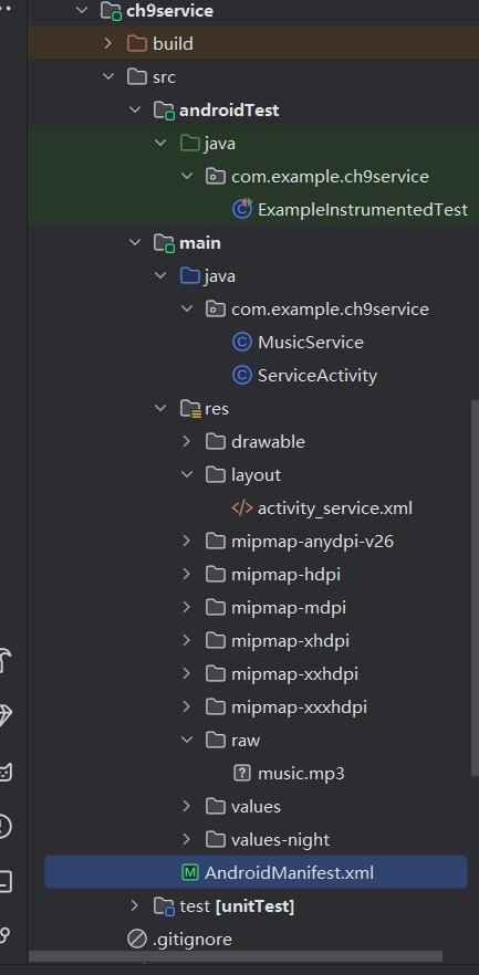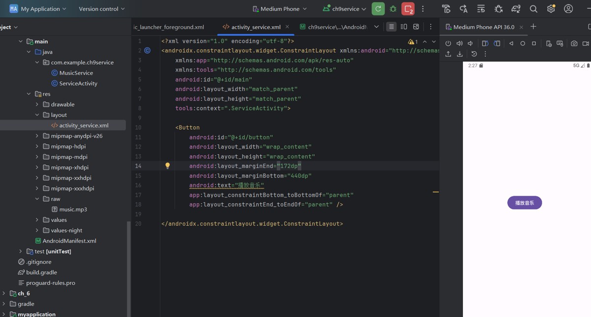 com.example.ch9service ├── MusicService.java // 核心Service:管理音乐播放/暂停/释放 ├── ServiceActivity.java // 界面Activity:提供播放/暂停按钮交互 ├── res │ ├── raw // 音乐资源文件夹(存放music.mp3) │ │ └── music.mp3 │ ├── layout │ │ └── activity_service.xml // 界面布局(仅1个按钮) │ └── values │ └── strings.xml └── AndroidManifest.xml // 清单文件:注册Service和Activity