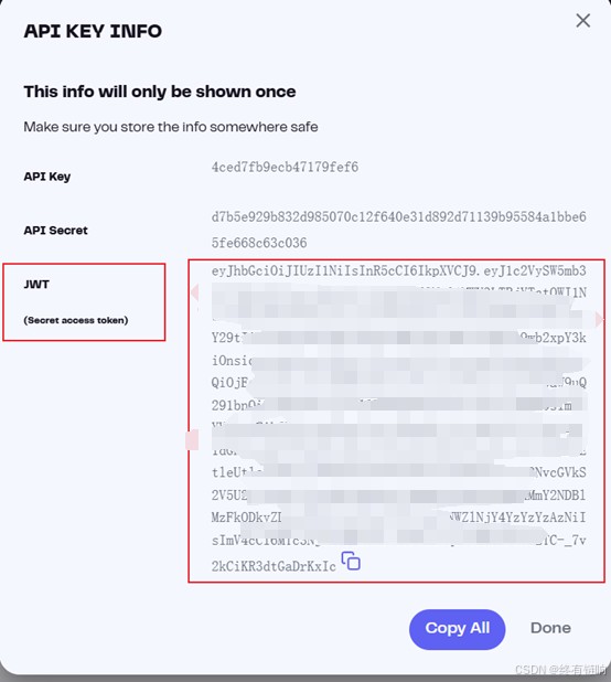 jwt令牌只在生成的时候会出现一次,所以生成APIKEY后要自己保存好jwt令牌,后面无法在让令牌显示出来了,后面调用api接口的时候都需要用到这个jwt令牌的。