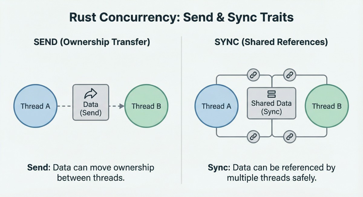 Send:类型的值能不能在线程之间“移动所有权”。Sync:类型的值能不能在多个线程中“共享引用 &T”。- 对同一个值进行