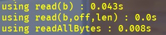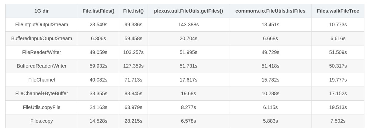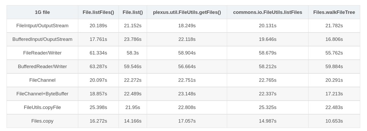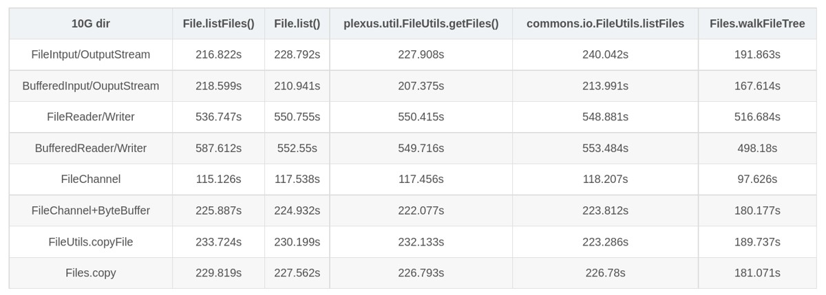 所以呢,看看各种方法效率怎么样,主要衡量的标准就是时间,另外的一些标准包括大文件的复制时的内存溢出等问题。