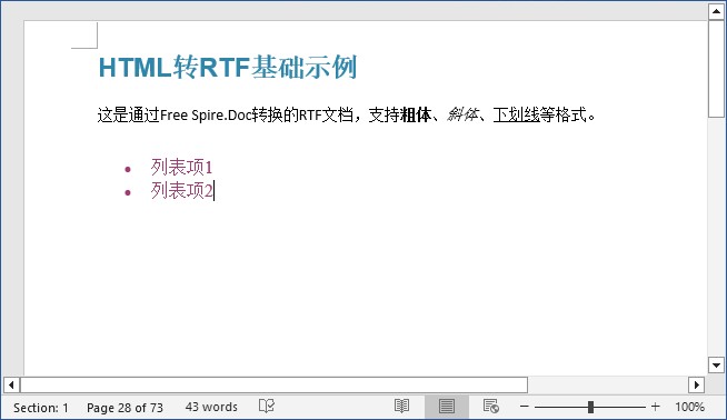 运行效果:生成的RTF文件可在Word中打开,完美保留标题颜色、字体、列表样式及文本格式。