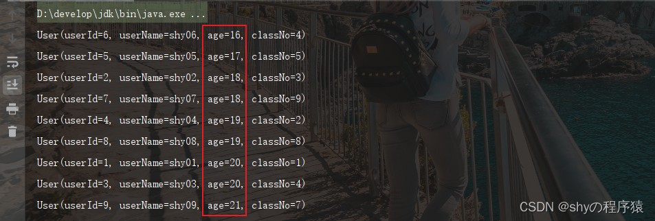 //方法1:先对年龄进行升序,升序结果进行反转,再进行班级升序,结果进行反转(有点绕,年龄被排了三次升-降-升) userList = userList.stream().sorted(Comparator.comparing(User::getAge).reversed().thenComparing(User::getClassNo).reversed()).collect(Collectors.toList()); //方法2:直接对年龄进行升序,再对班级进行降序 userList = userList.stream().sorted(Comparator.comparing(User::getAge).thenComparing(User::getClassNo, Comparator.reverseOrder())).collect(Collectors.toList());