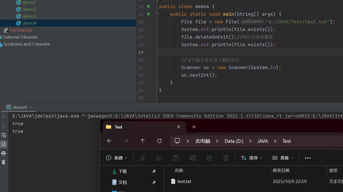 这里输入会阻塞主线程,所以当我输入输入未完成的时候,其文件还处于未删除状态,当输入完成,后面没有什么逻辑,其就会开始删除了