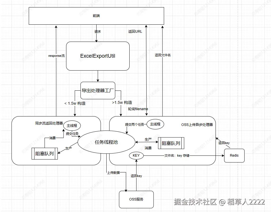 SampleExportHandler:处理数据量较小(如 ≤ 2W 条)的场景,直接同步响应流返回文件。OssExportHandler(文中提及):处理大数据量场景,异步导出至 OSS,前端通过轮询或通知下载。