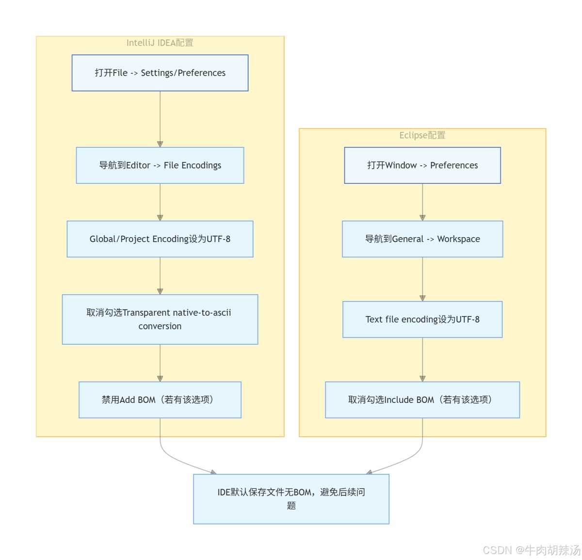 File -> Settings -> Editor -> File Encodings,确保“Default encoding for properties files”设置为“UTF-8”,并且取消勾选“Add BOM”。 - Eclipse:同样可以在设置中进行调整。进入