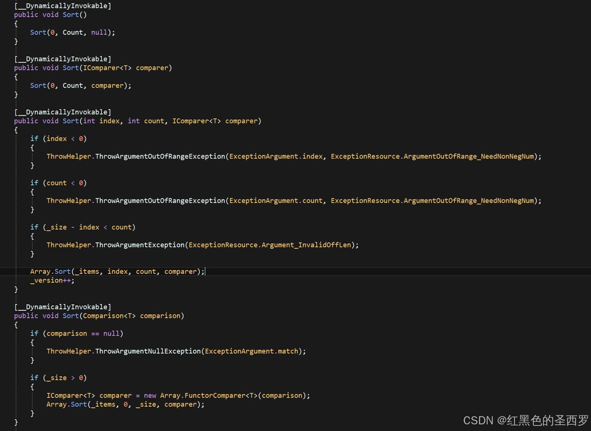 第三个方法的index参数表示从哪个索引开始,count表示要排序的个数,comparer表示实现了IComparer接口的类型,用于实现排序规则,可以看到前两个方法都是从头开始全量排序。