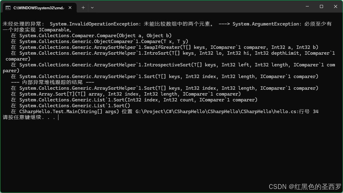 即比较的最终执行是判断比较的两个对象是否实现了IComparable接口,而传入的Demo类型并没有实现这个接口,所以最终报错