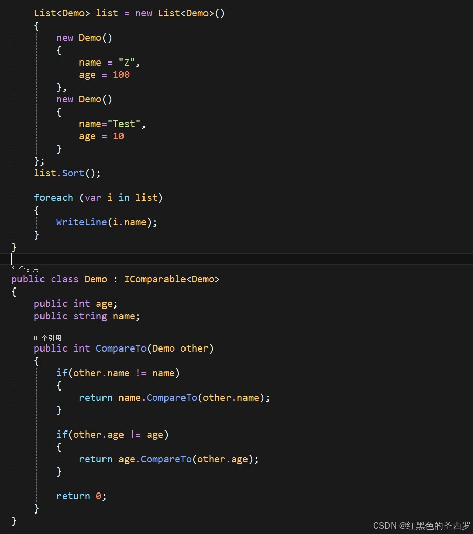 比如这里的Demo类型,实现了自定义的比较方法,先比较name,再比较age