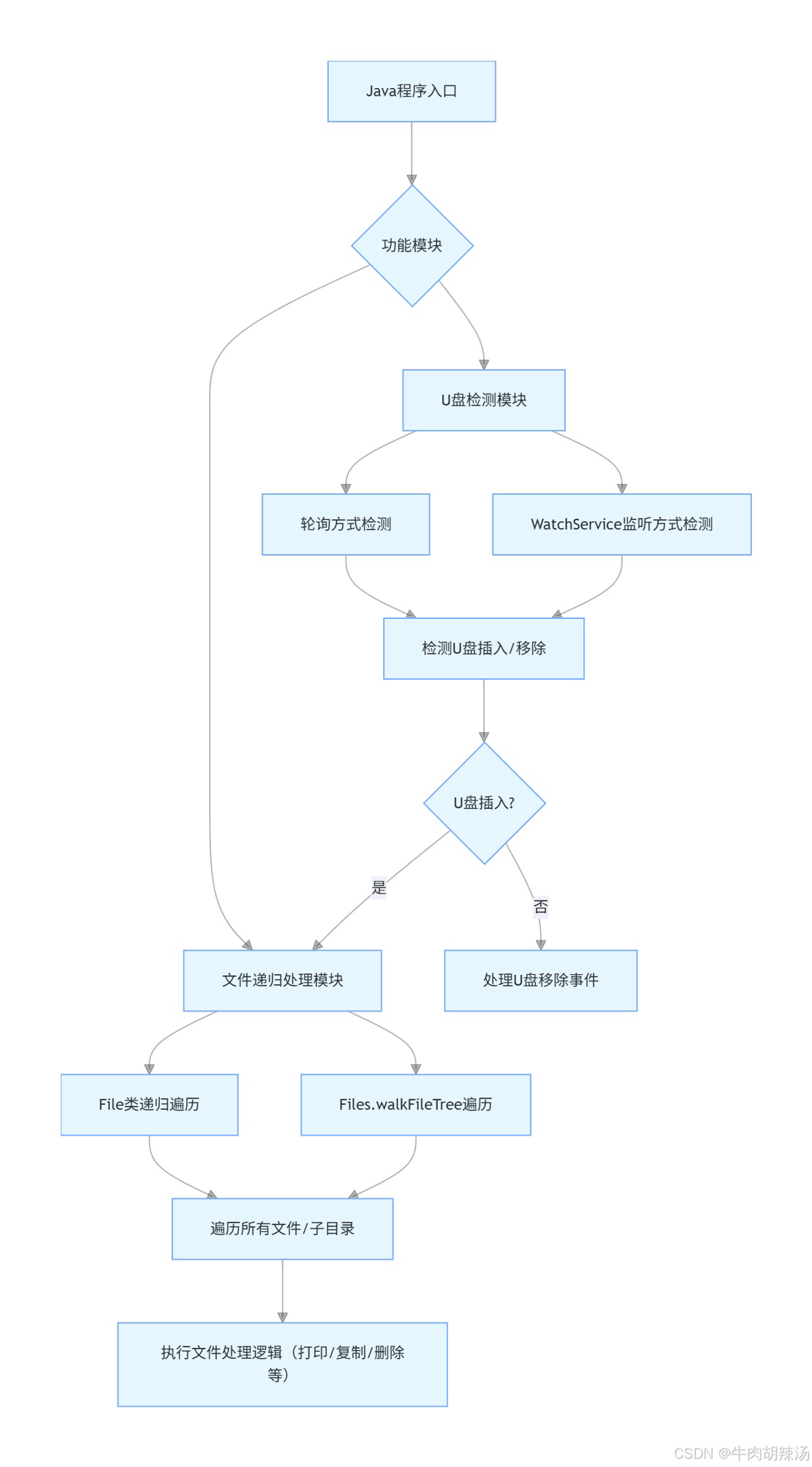 在上面的USBDriveDetector类中,当检测到U盘插入时,调用了FileRecursion.recursiveProcess(new File(drive));方法来递归处理U盘中的文件。这样,当U盘插入时,程序会自动遍历U盘中的所有文件并进行处理。