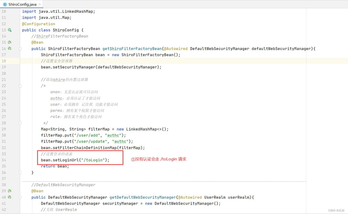 1、在ShiroConfig中设置访问哪些路径,需要哪些权限,并配置未授权页面