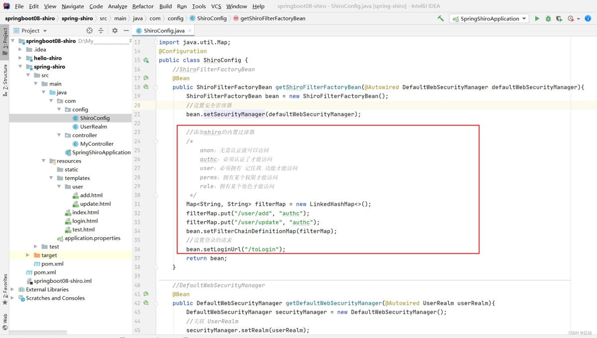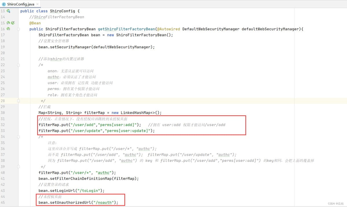 filterMap.put("/user/update","perms[user:update]"); bean.setUnauthorizedUrl("/noauth");