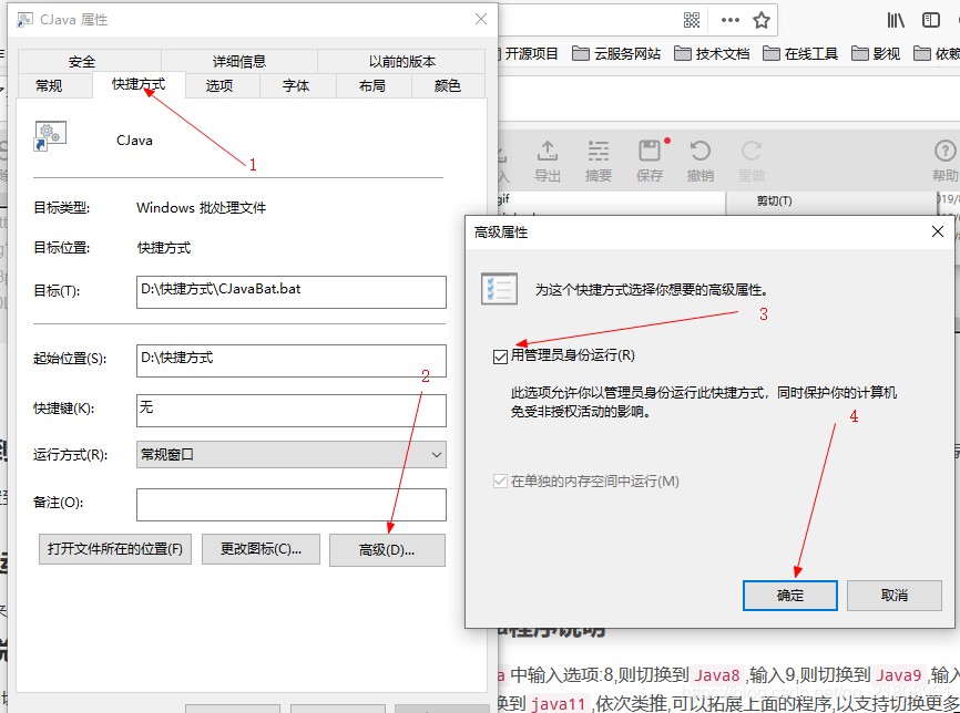 这样以后直接点击CJava这个快捷方式就可以以管理身份运行CJavaBat.bat这个批处理脚本了。