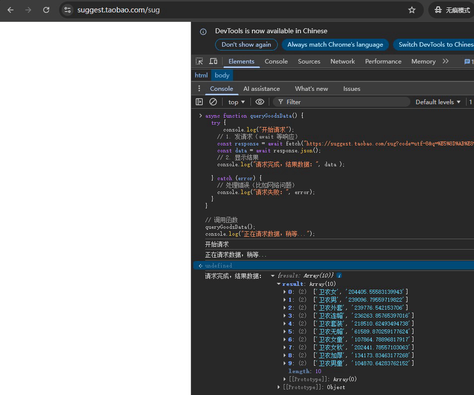 先试用浏览器访问 https://suggest.taobao.com/sug(为了解决跨域问题),然后启用控制台,将上述代码直接复制到控制台,会看到先输出"正在请求数据",然后过一会儿显示获取到的商品信息。