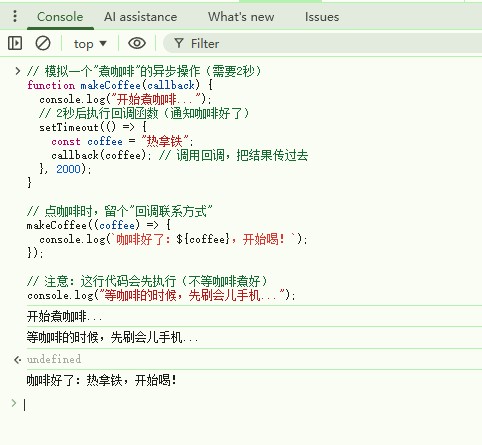 // 注意:这行代码会先执行(不等咖啡煮好)
