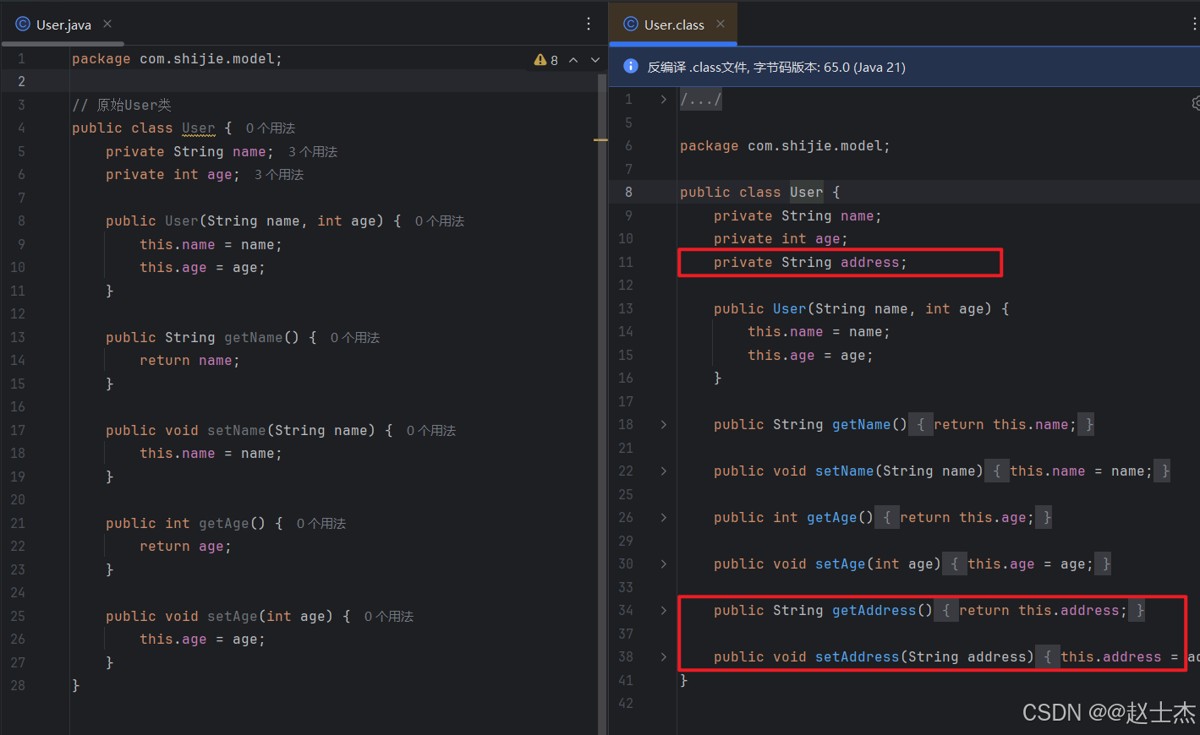 下面通过一个案例实践 ASM 的核心用法:为User类添加private String address字段,并自动生成getAddress()和setAddress()方法。