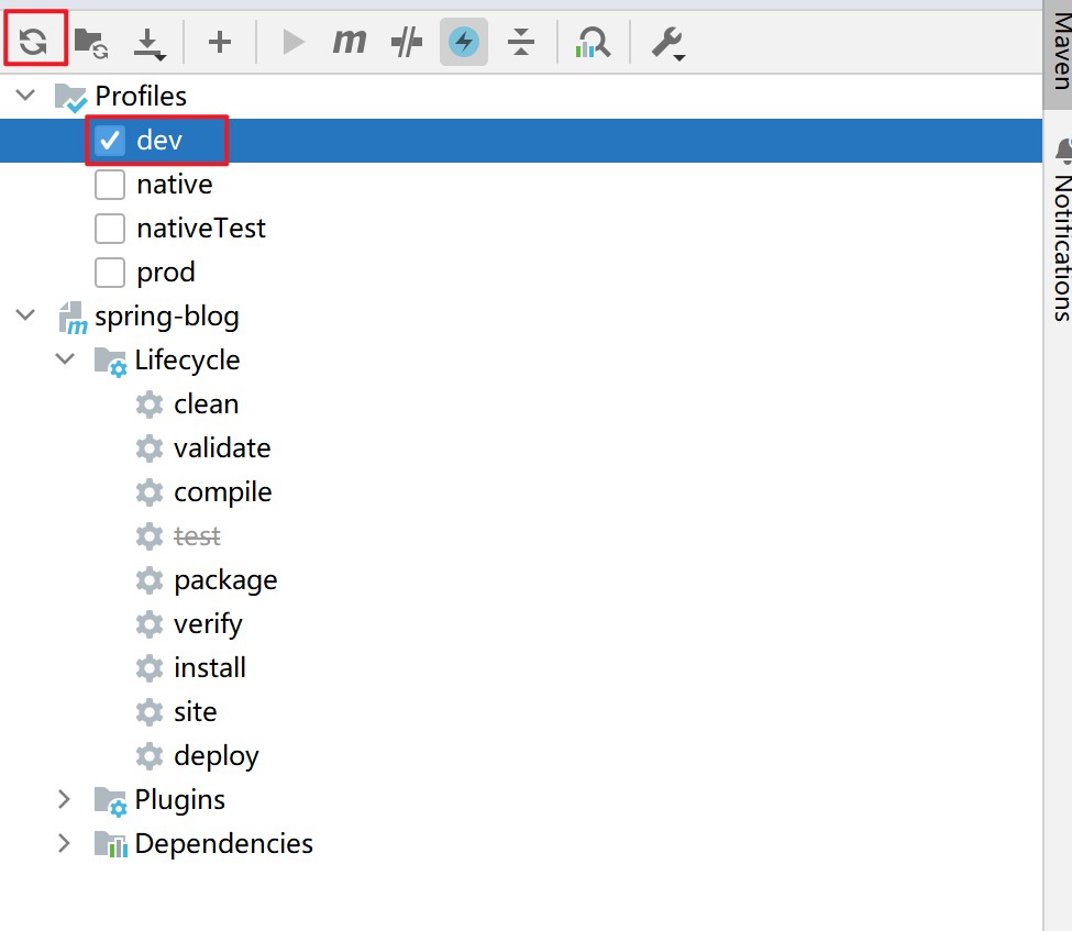 1. 需要选择使用哪个配置文件,勾选好之后,要刷新,重新加载 Maven 配置;