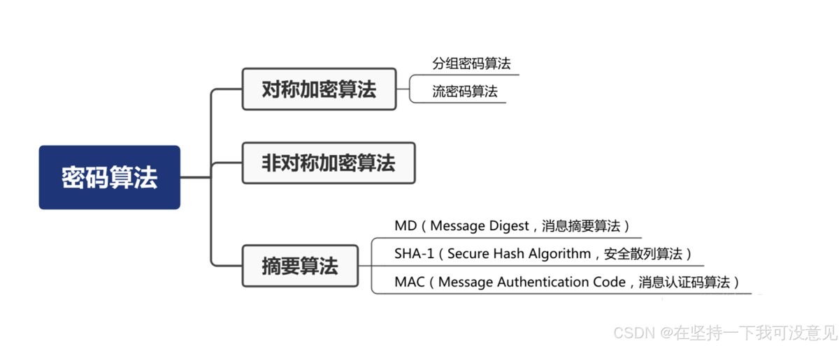 密码算法主要分为三类:对称密码算法,⾮对称密码算法,摘要算法