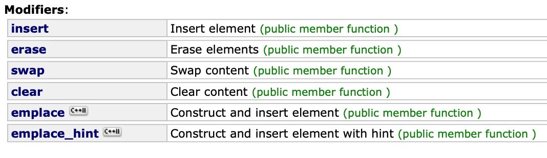这是C++ std::set的修改器(Modifiers)成员函数,负责对set的元素进行增删等操作。以下结合代码示例逐一讲解: