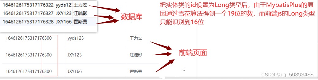 还有,如果你简单的以为把数据库表中原先19位的用户id全部改为1,2,3,4....等短而简单的数字作为id,配合@TableId注解,想着添加新的User的时候生成的 id 就不会是19位的数字了,但结果依旧为19位的数字,还是那句话数据库保留了之前雪花算法id的最大值,从此以后就以这个最大值为基础进行自增。