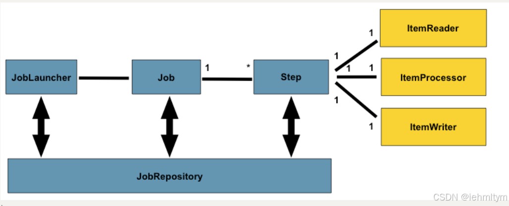 Batch Core:核心层,包含Spring Batch启动和控制所需要的核心类,比如:JobLauncher, Job,Step等。