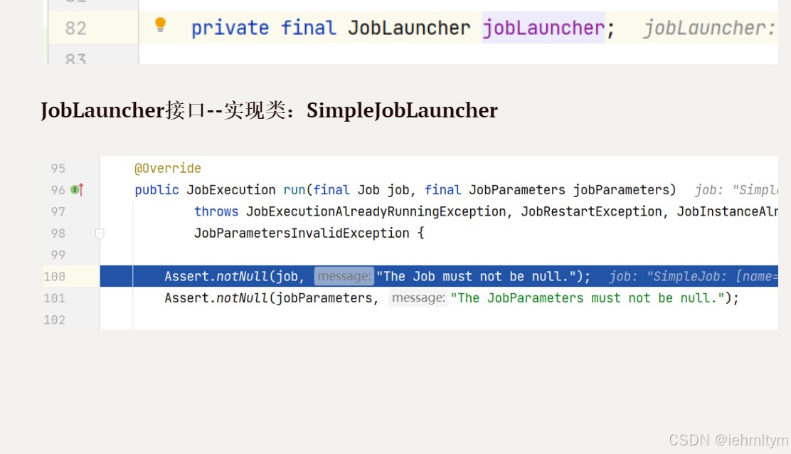 //job调度器 @Autowired private JobLauncher jobLauncher; //job构造器工厂 @Autowired private JobBuilderFactory jobBuilderFactory; //step构造器工厂 @Autowired private StepBuilderFactory stepBuilderFactory;