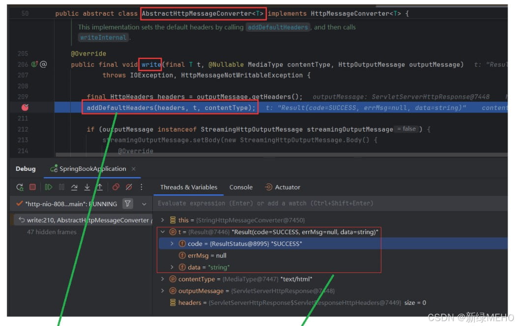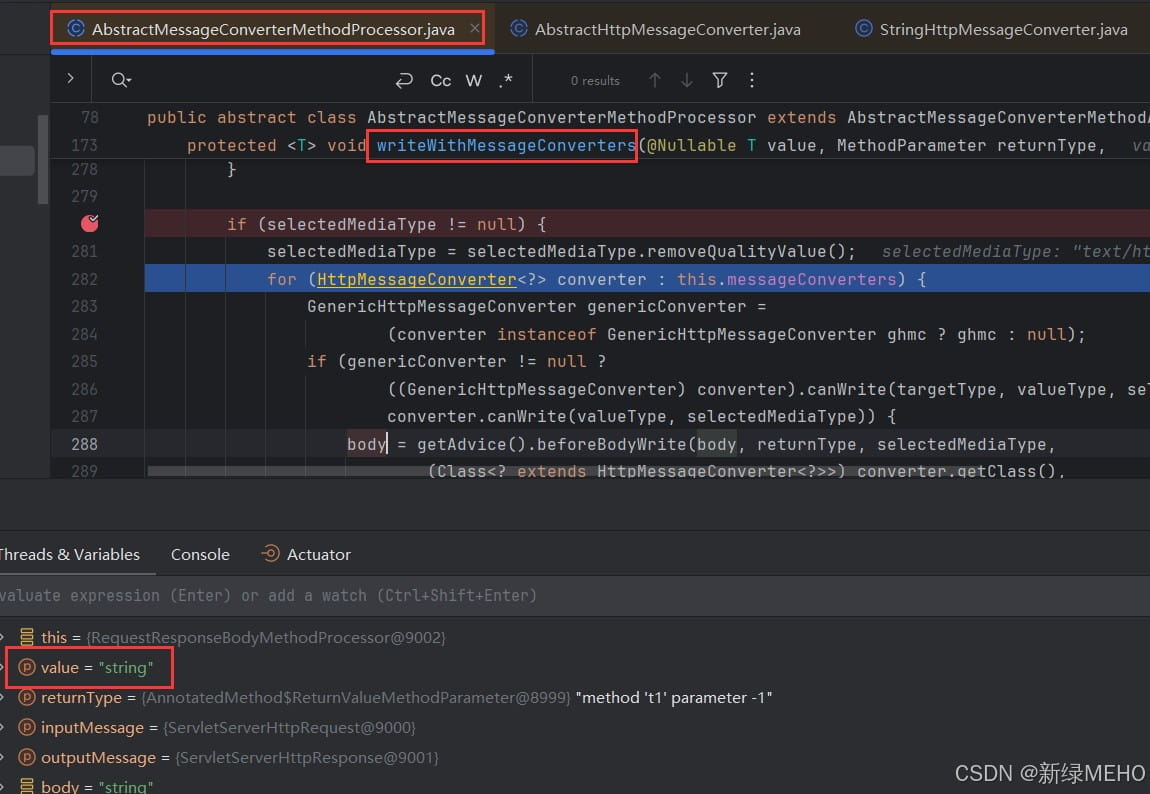 根据IDEA控制台打印的堆栈信息,我们首先看看StringHttpMessageConverter和AbstractHttpMessageConverter这两个类,特别是StringHttpMessageConverter的addDefaultHeaders方法和AbstractHttpMessageConverter的write方法,其中StringHttpMessageConverter是继承了AbstractHttpMessageConverter并重写了几个方法,特别是addDefaultHeaders方法,下面通过Debug方式运行: