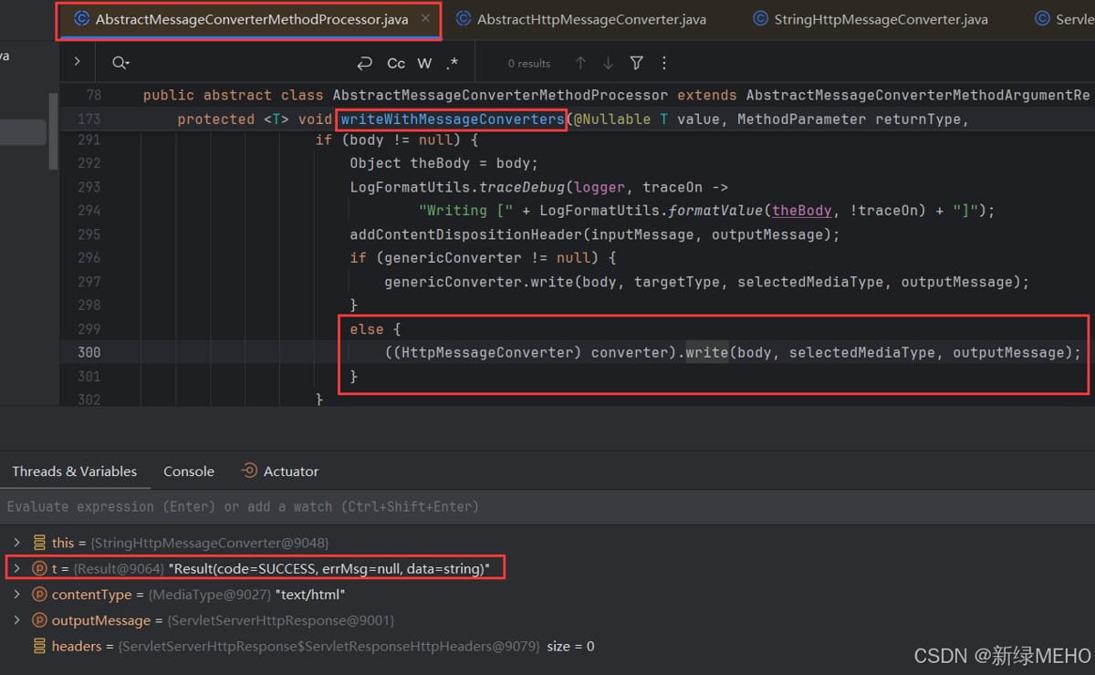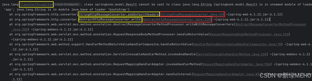 由此我们知道,是因为返回结果为String类型的"string"被转换成了Result类型,但是在执行AbstractHttpMessageConverter的write方法时,因为AbstractHttpMessageConverter的派生类StringHttpMessageConverter重写了addDefaultHeaders方法,此时会调用StringHttpMessageConverter的addDefaultHeaders方法,但是StringHttpMessageConverter的addDefaultHeaders方法要求 t 的类型是String类型,但是无法从自定义的Result类型转换成String类型,因此抛出了ClassCastException异常。
