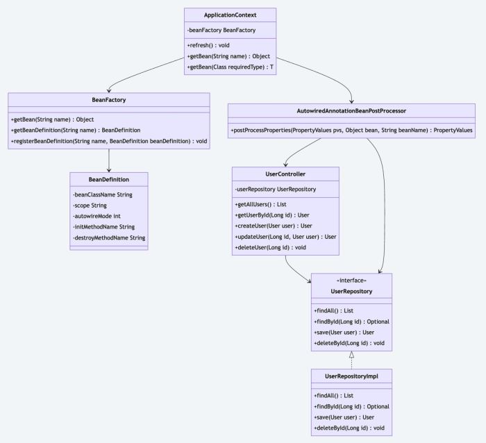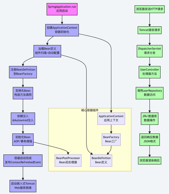 @Autowired实现Bean之间的依赖注入,如UserController依赖UserRepository - 核心组件:BeanFactory管理Bean,ApplicationContext提供完整容器功能,BeanDefinition定义Bean元数据,BeanPostProcessor增强Bean功能